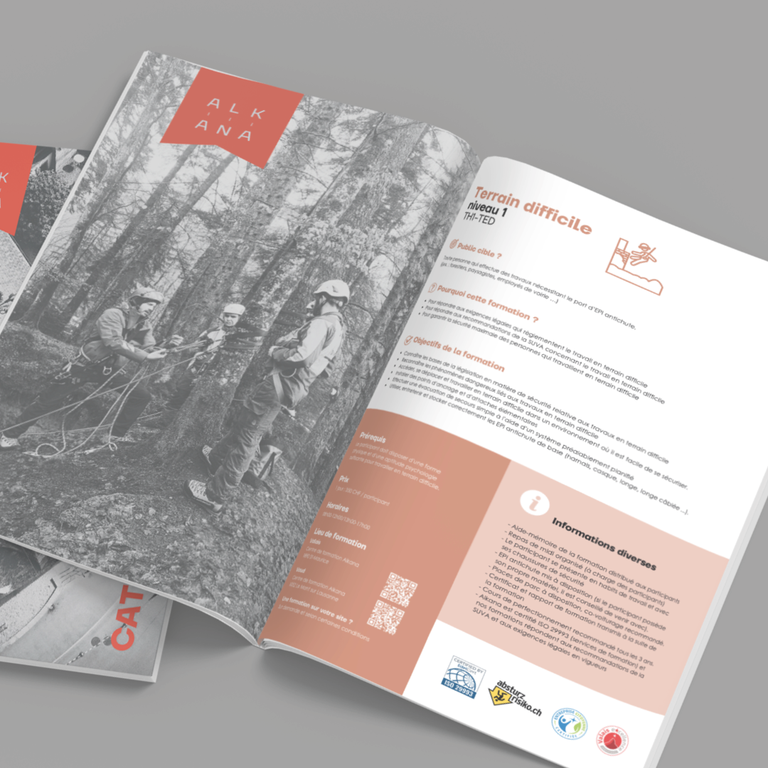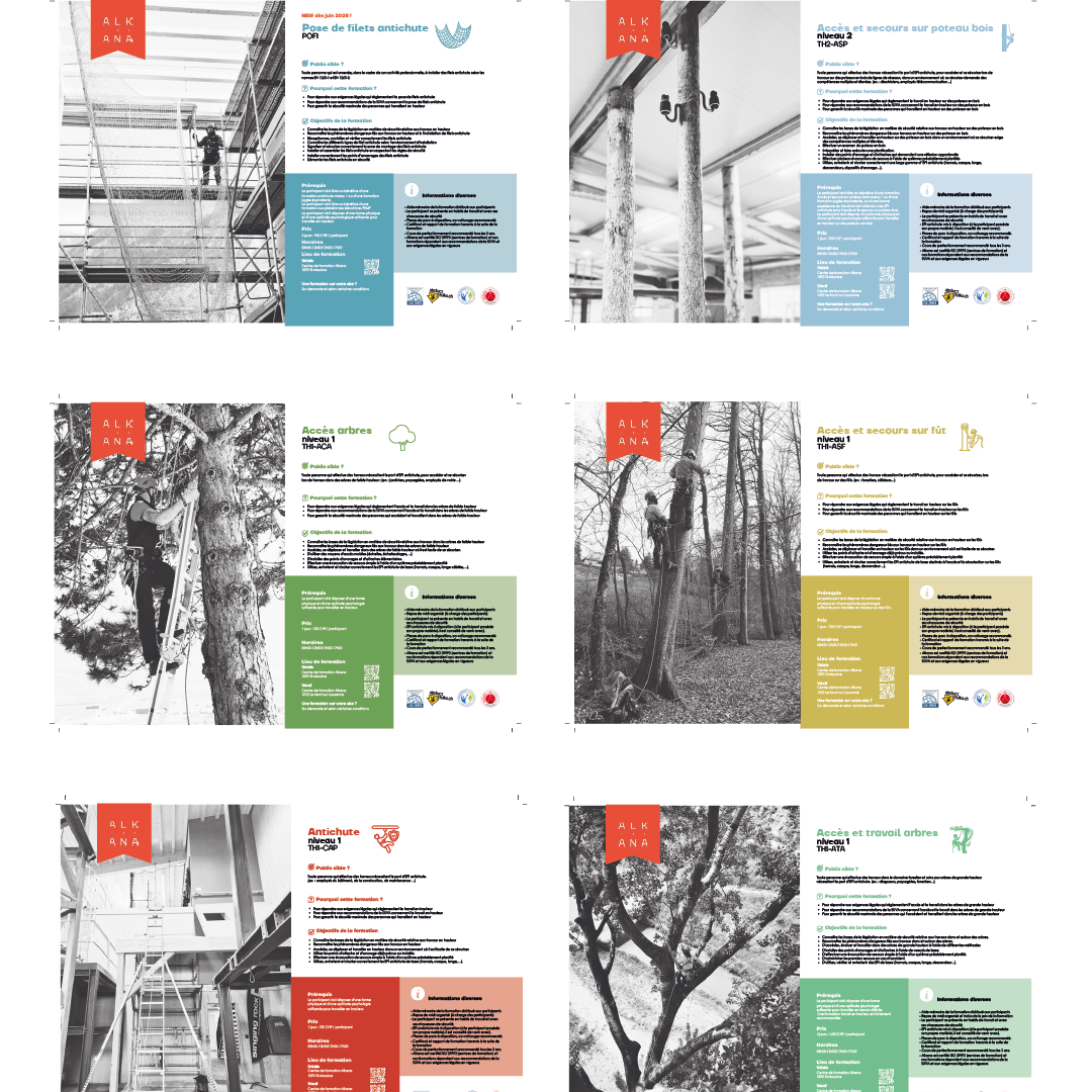 Nous avons développé une charte graphique dédiée à l’univers de la formation, puis décliné celle-ci sur différents supports, notamment des livrets pédagogiques et des fiches de présentation de formations. L’ensemble a été pensé pour offrir une lecture claire, hiérarchisée et accessible, tout en reflétant le sérieux et l’expertise d’ALKANA.